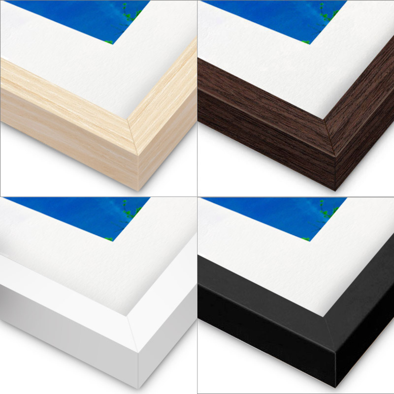 Framed prints are professionally dry-mounted to a foam core backing for a smooth, long-lasting finish. Each piece includes a 1.5-inch white mat and is protected with clear acrylic glass. The back of every frame is neatly finished with kraft paper and fitted with hanging wire for easy display.