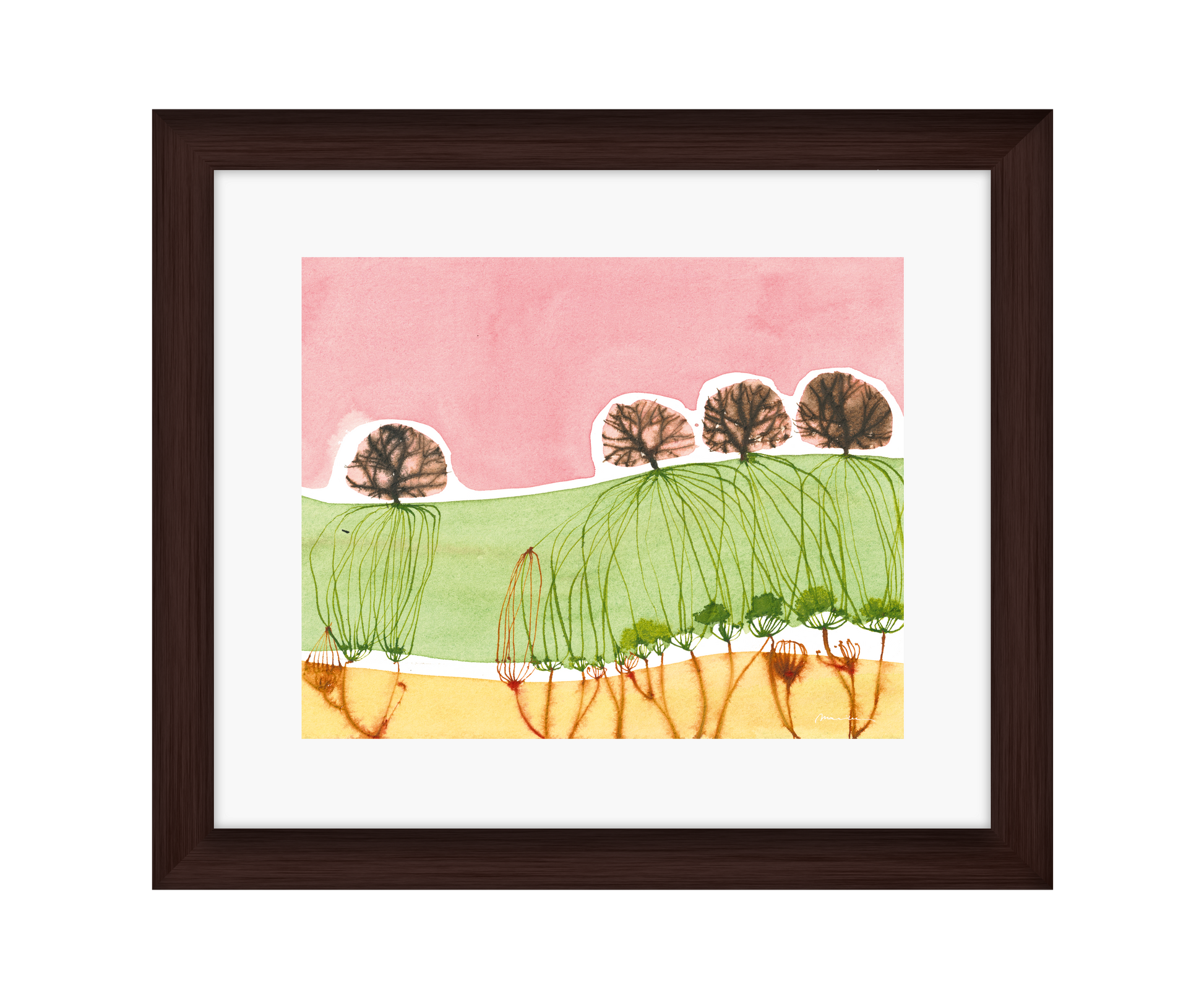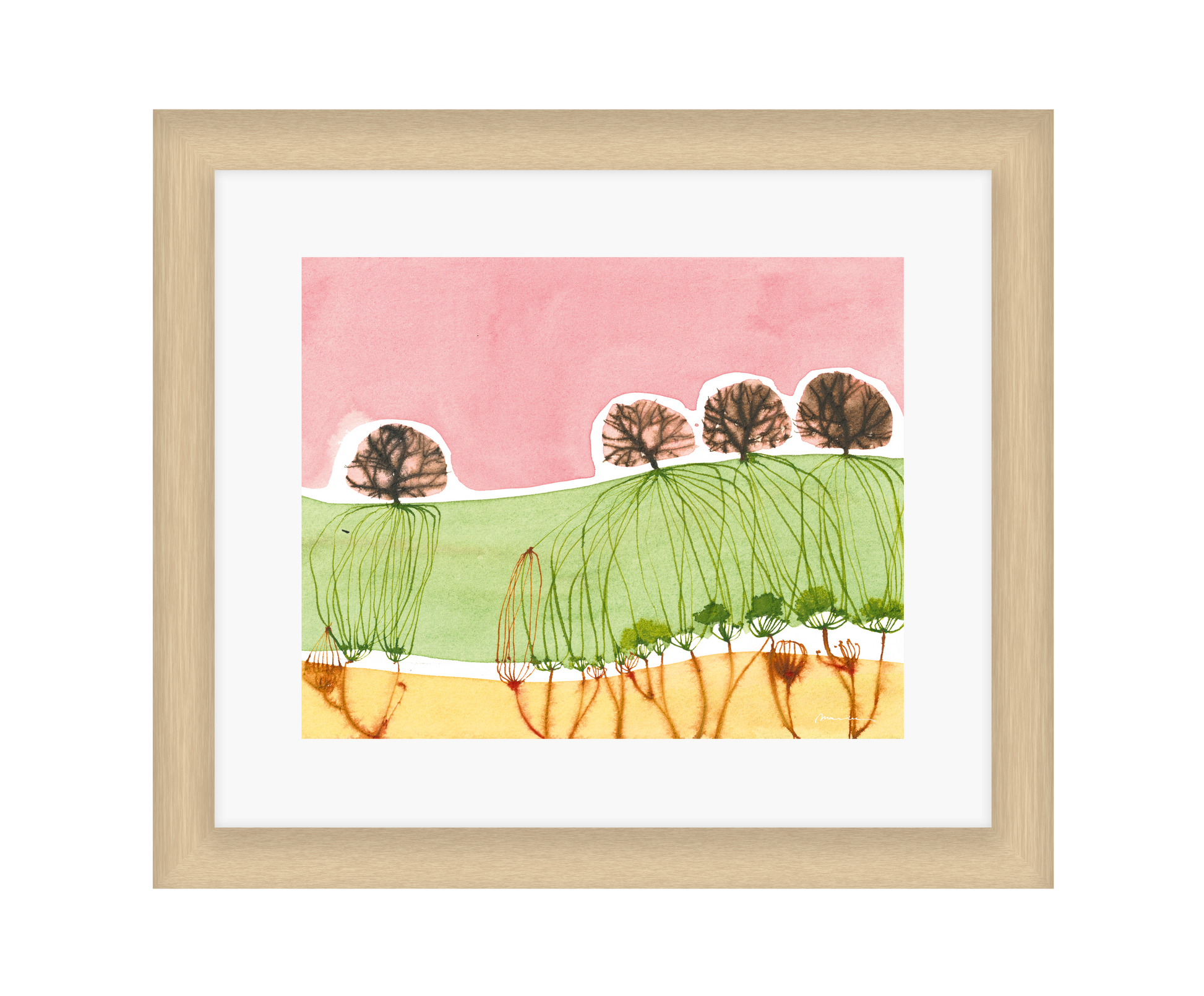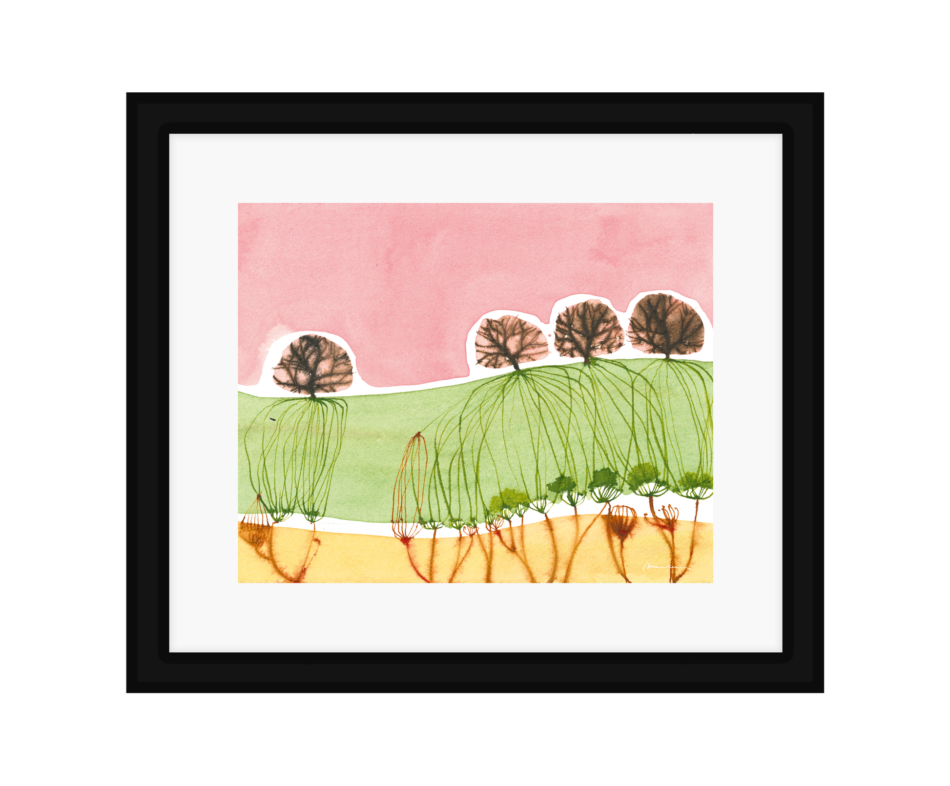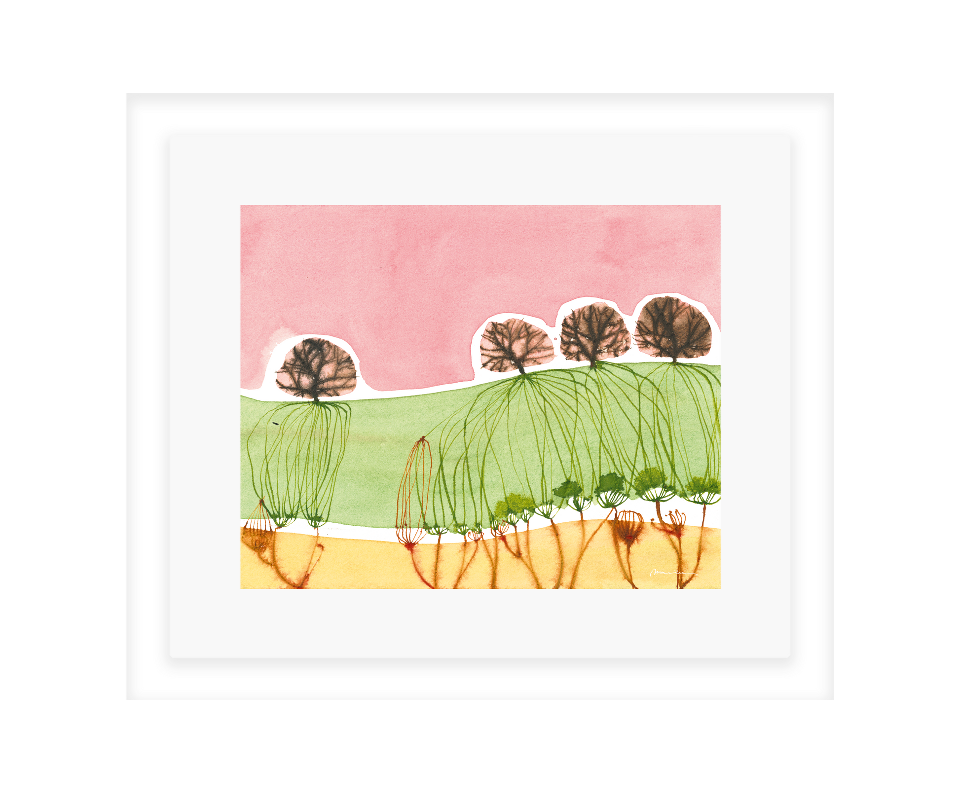 Mariken van Heugten’s work traces the delicate boundary between the organic and the abstract. Working primarily with ink, she begins with simple forms—shapes found in nature, fleeting impressions, or marks of daily life—from which emerge compositions that feel fluid and whimsical. Her prints carry a quiet rhythm: soft washes of tone layered with bold, gestural lines, creating a visual language that feels timeless, tactile, and profoundly playful.