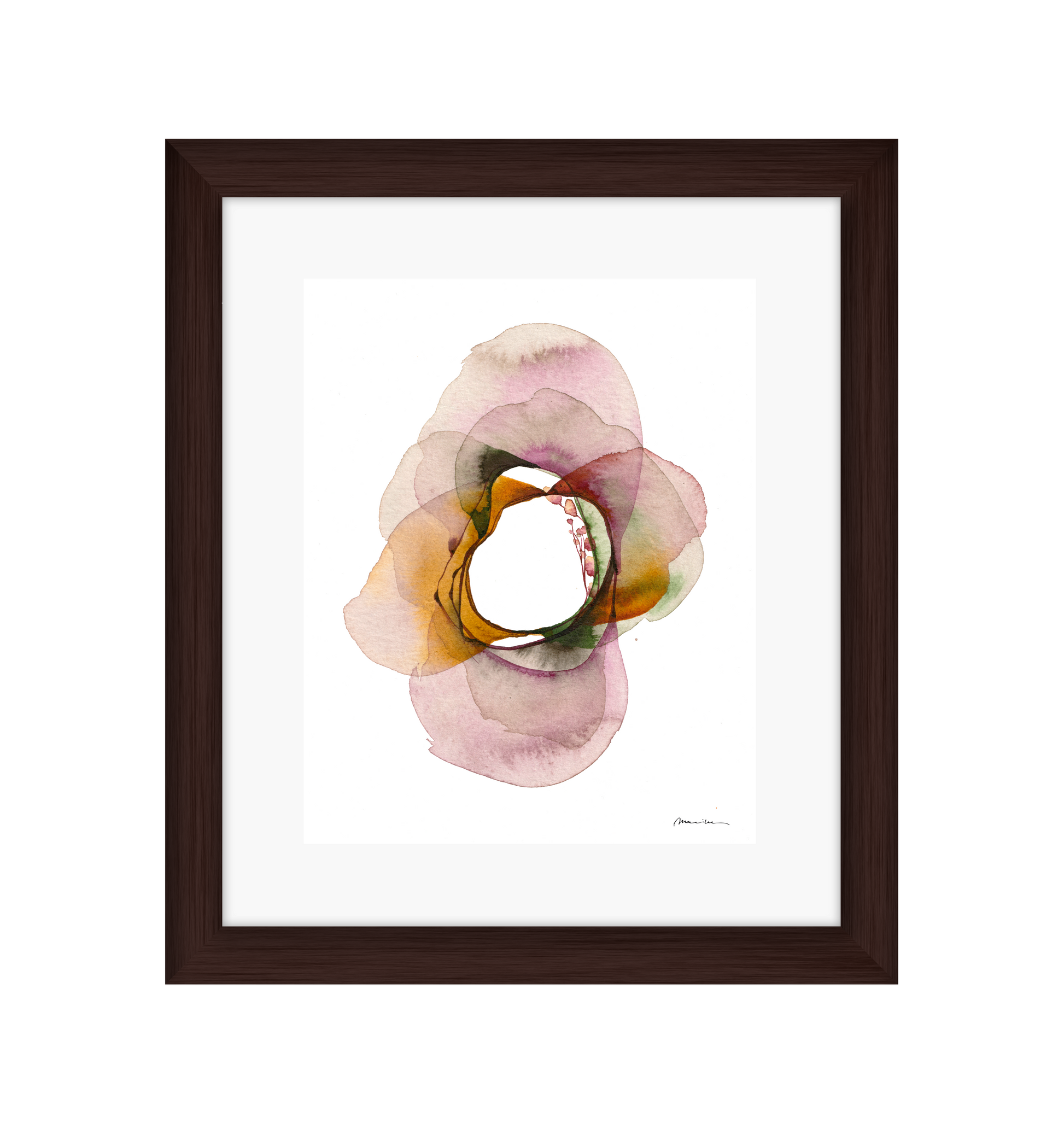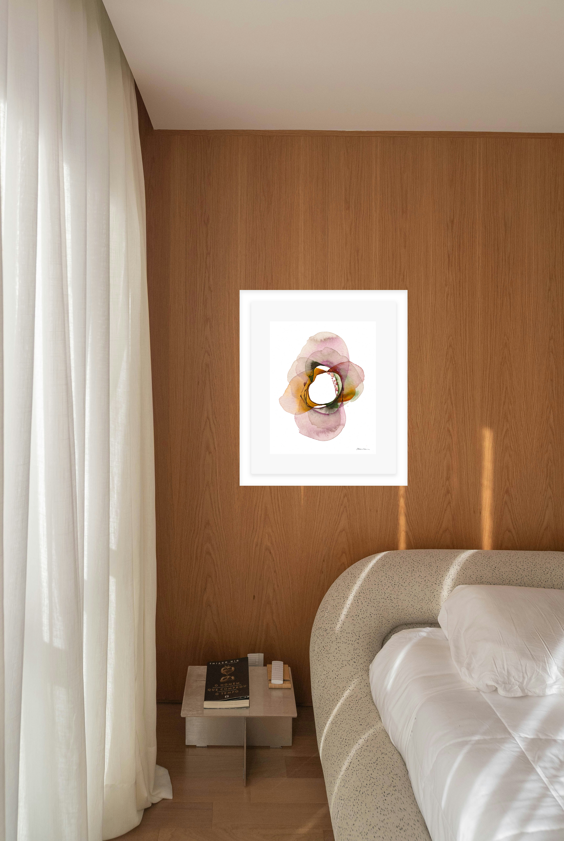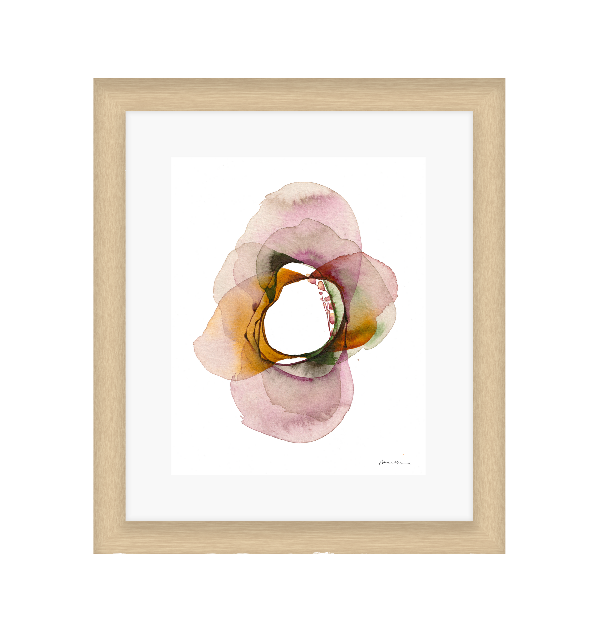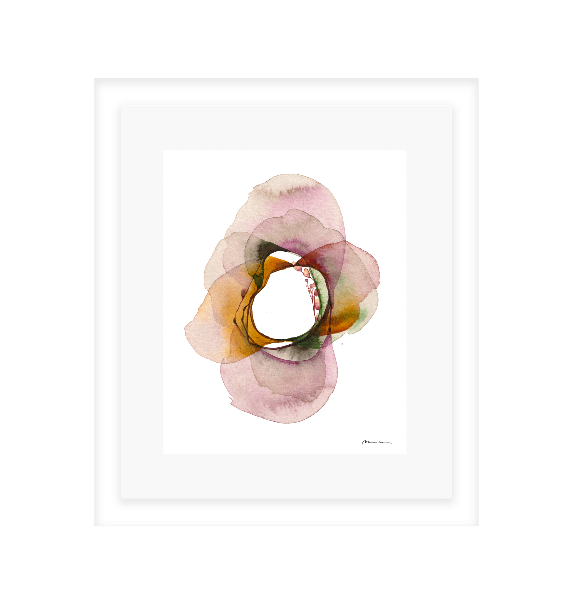 Mariken van Heugten’s work traces the delicate boundary between the organic and the abstract. Working primarily with ink, she begins with simple forms—shapes found in nature, fleeting impressions, or marks of daily life—from which emerge compositions that feel fluid and whimsical. Her prints carry a quiet rhythm: soft washes of tone layered with bold, gestural lines, creating a visual language that feels timeless, tactile, and profoundly playful.