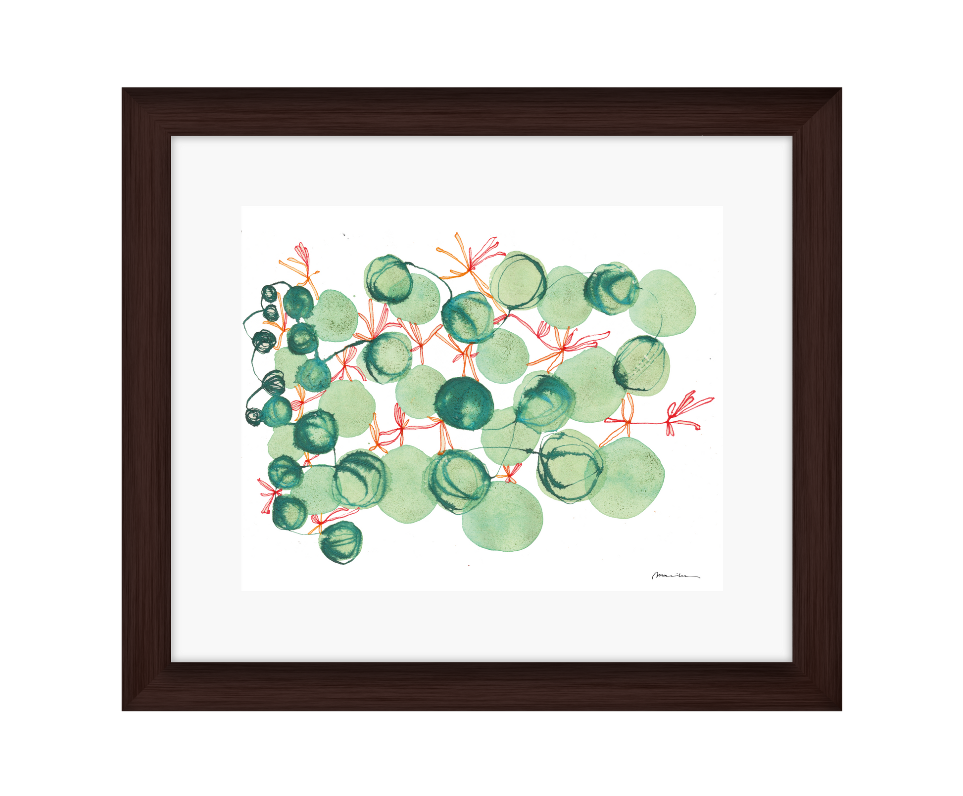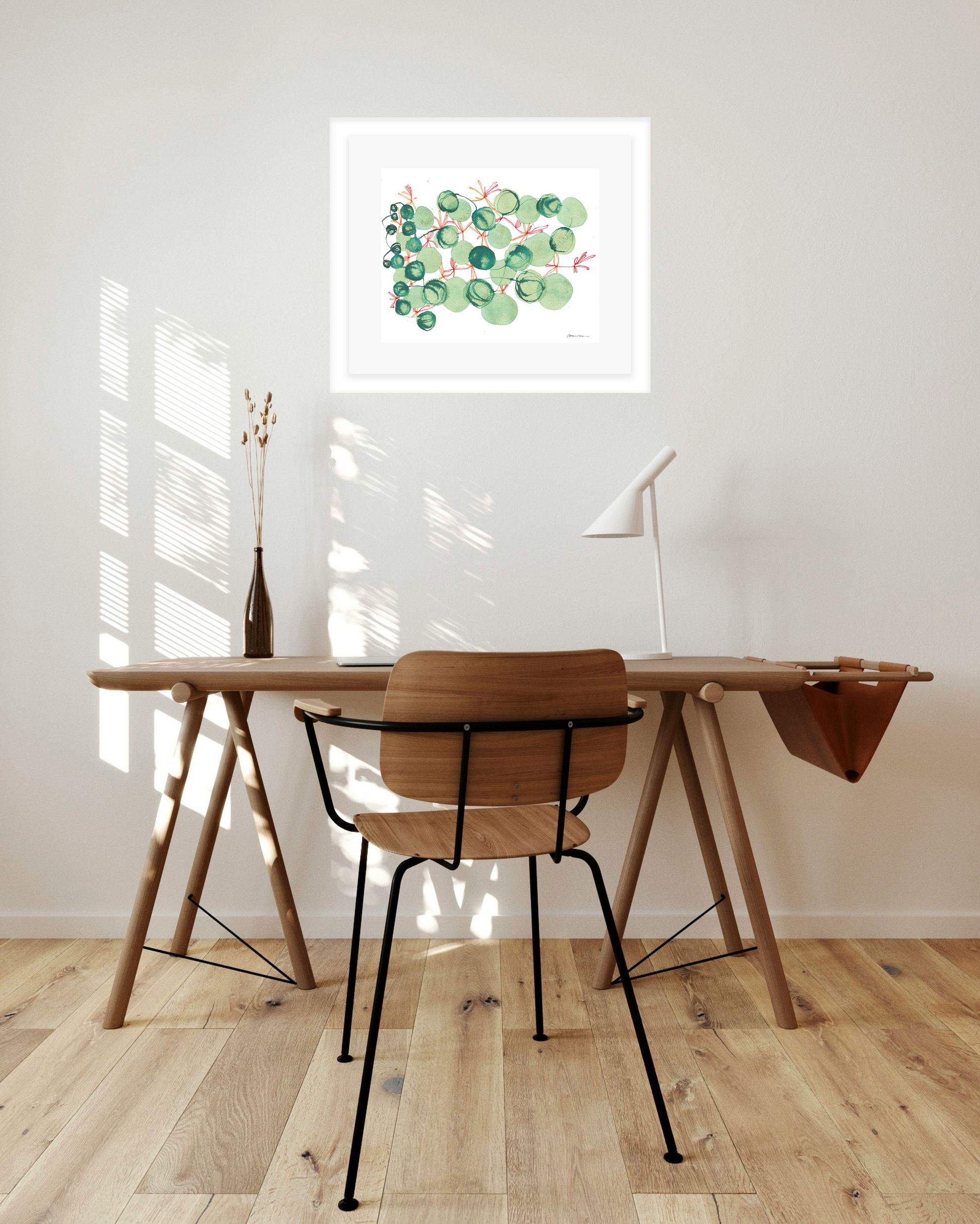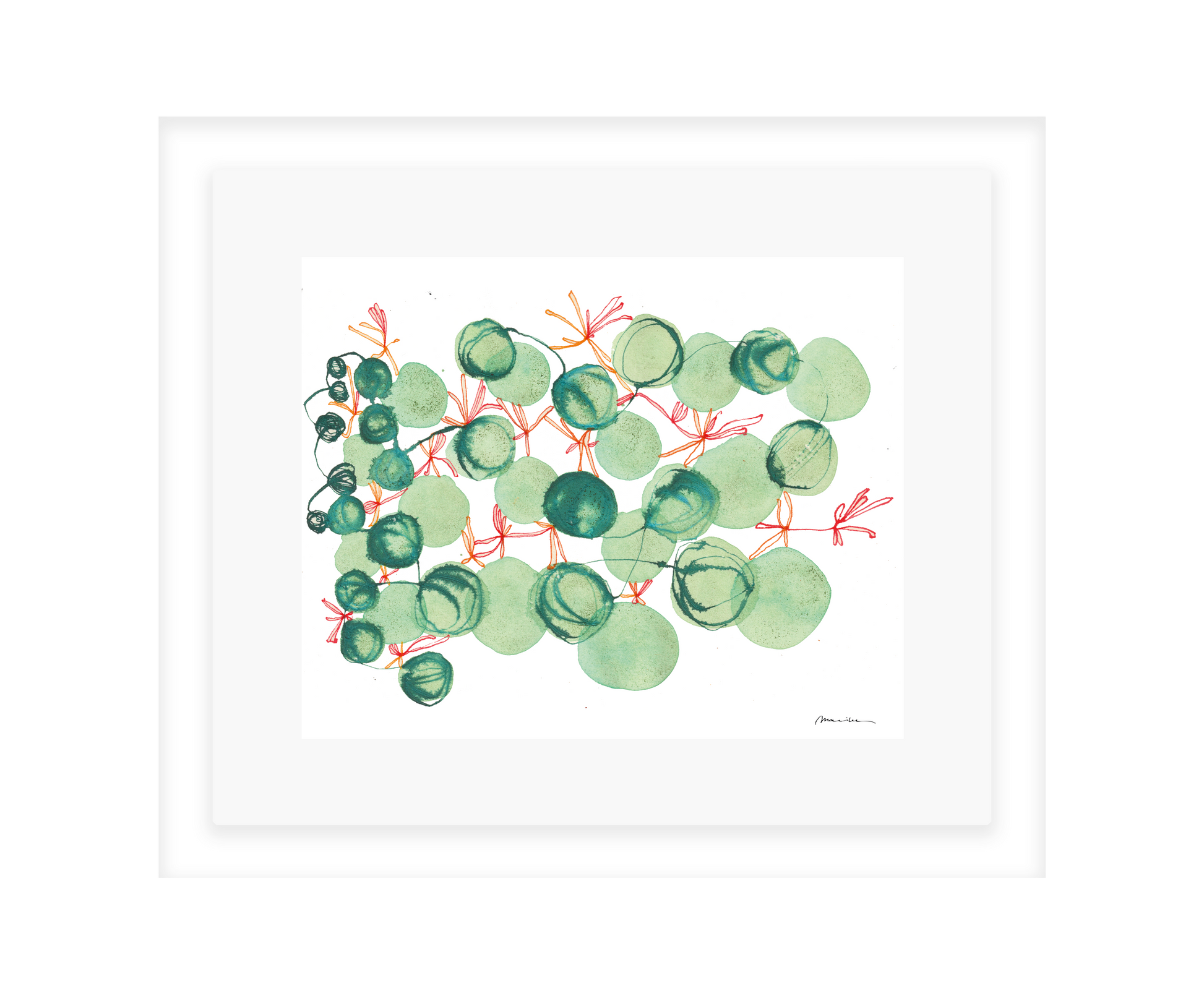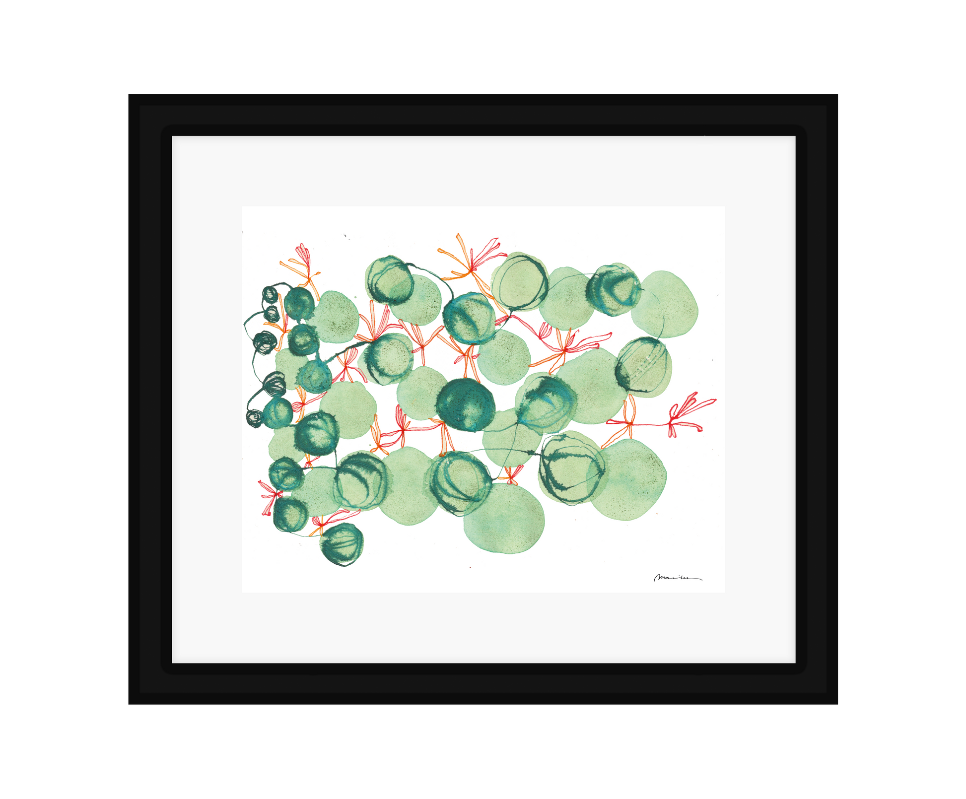 Mariken van Heugten’s work traces the delicate boundary between the organic and the abstract. Working primarily with ink, she begins with simple forms—shapes found in nature, fleeting impressions, or marks of daily life—from which emerge compositions that feel fluid and whimsical. Her prints carry a quiet rhythm: soft washes of tone layered with bold, gestural lines, creating a visual language that feels timeless, tactile, and profoundly playful.