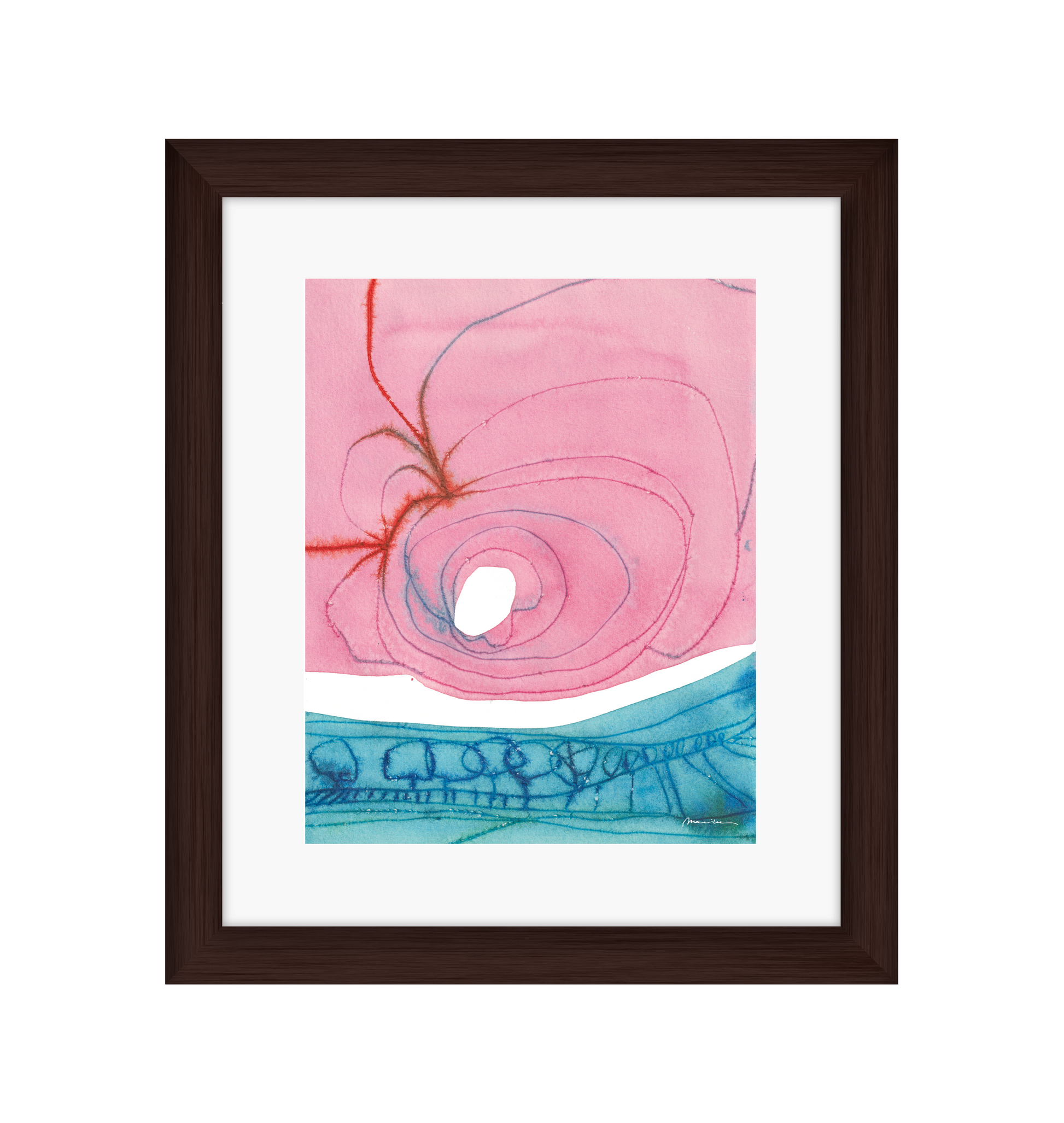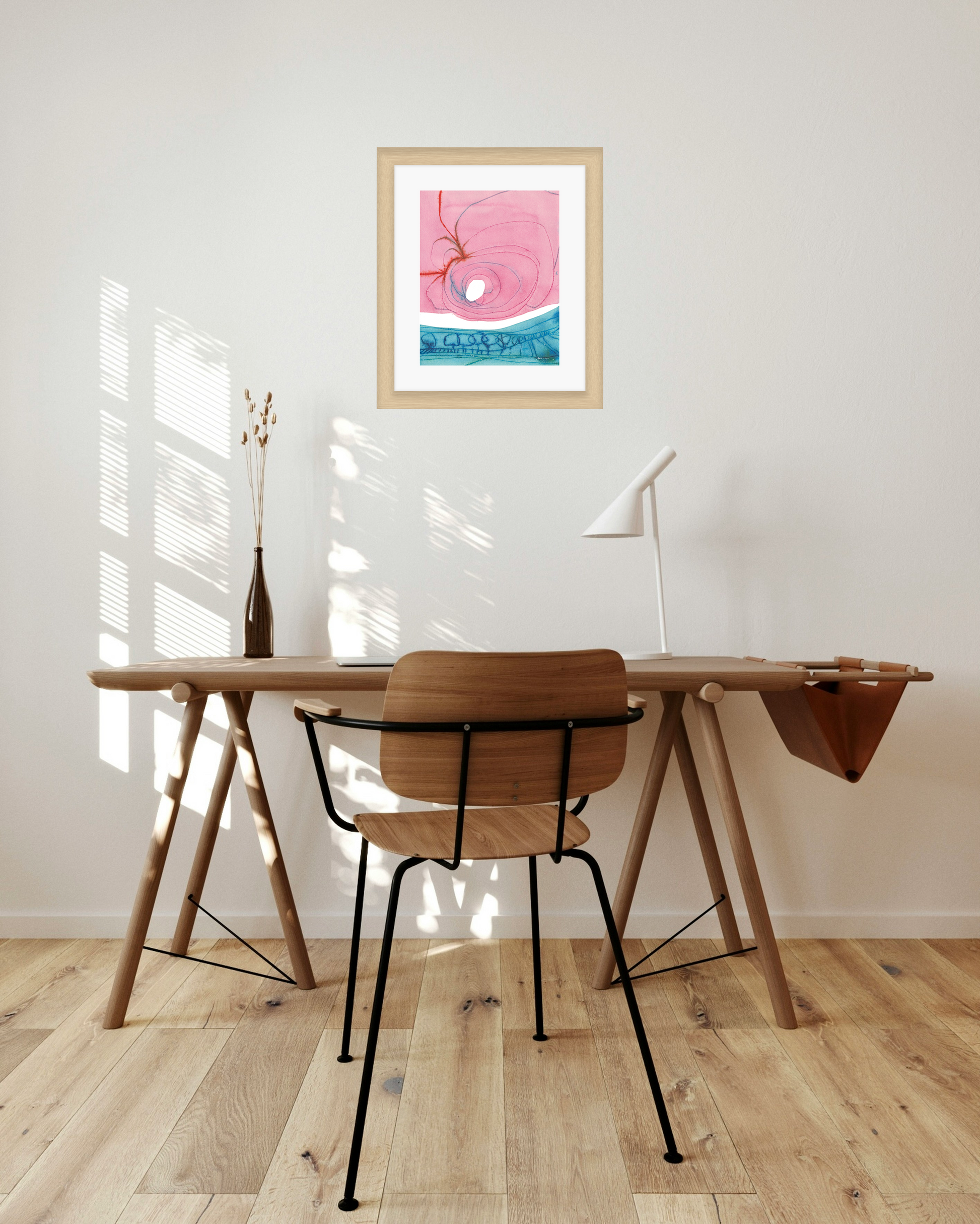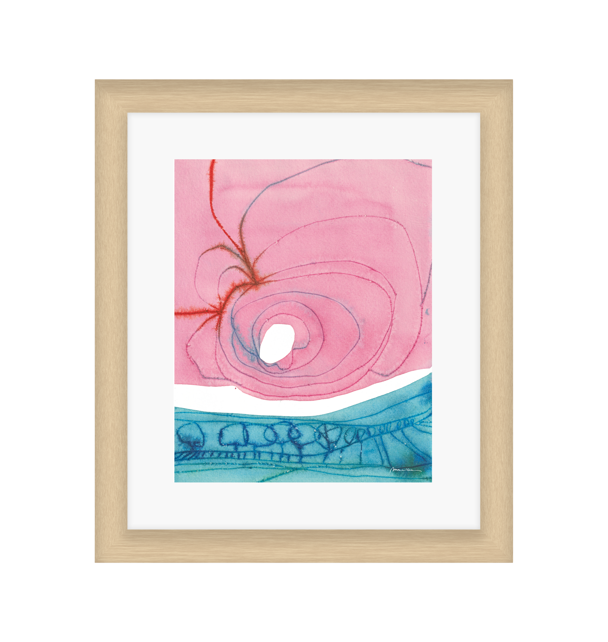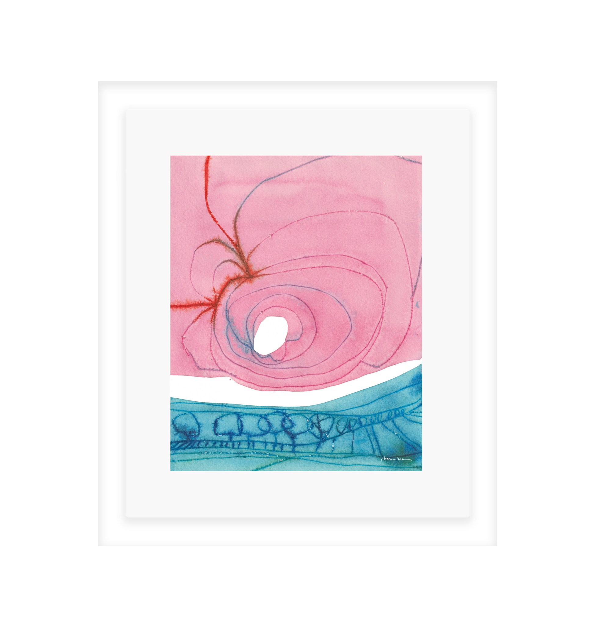 Mariken van Heugten’s work traces the delicate boundary between the organic and the abstract. Working primarily with ink, she begins with simple forms—shapes found in nature, fleeting impressions, or marks of daily life—from which emerge compositions that feel fluid and whimsical. Her prints carry a quiet rhythm: soft washes of tone layered with bold, gestural lines, creating a visual language that feels timeless, tactile, and profoundly playful.