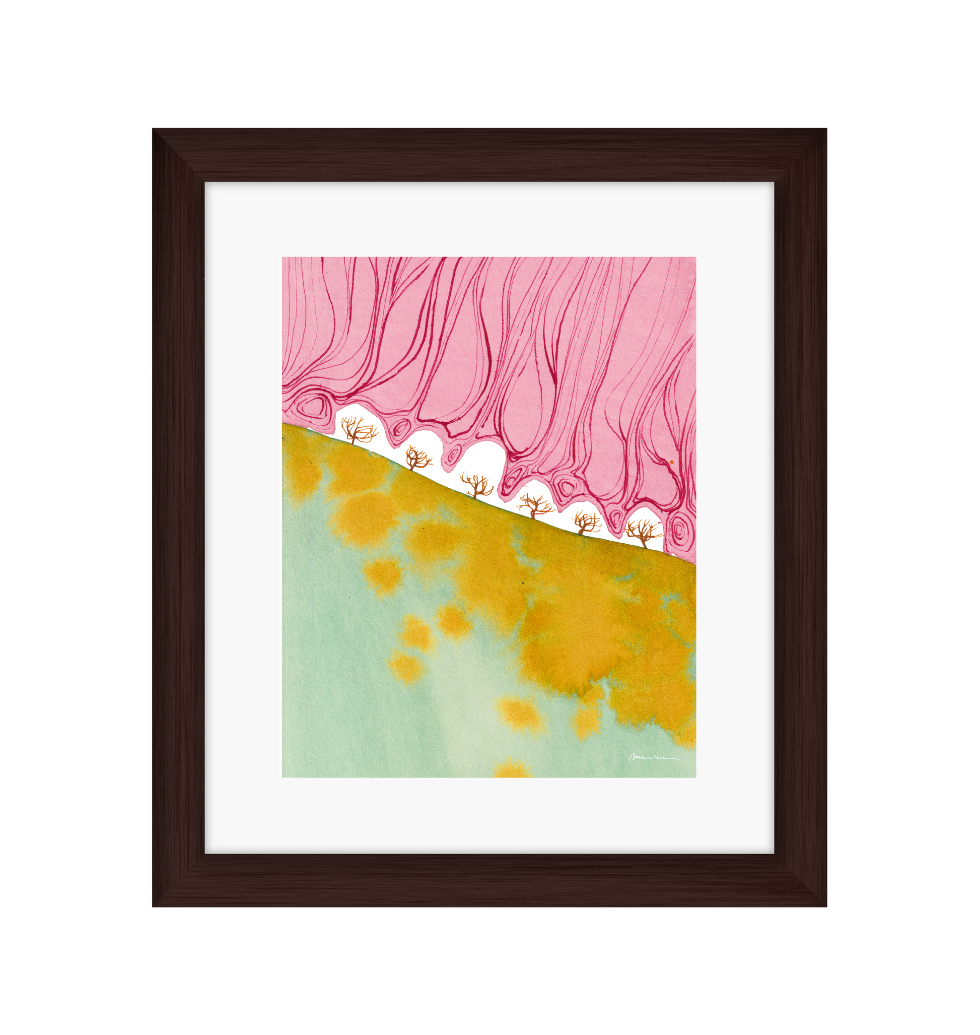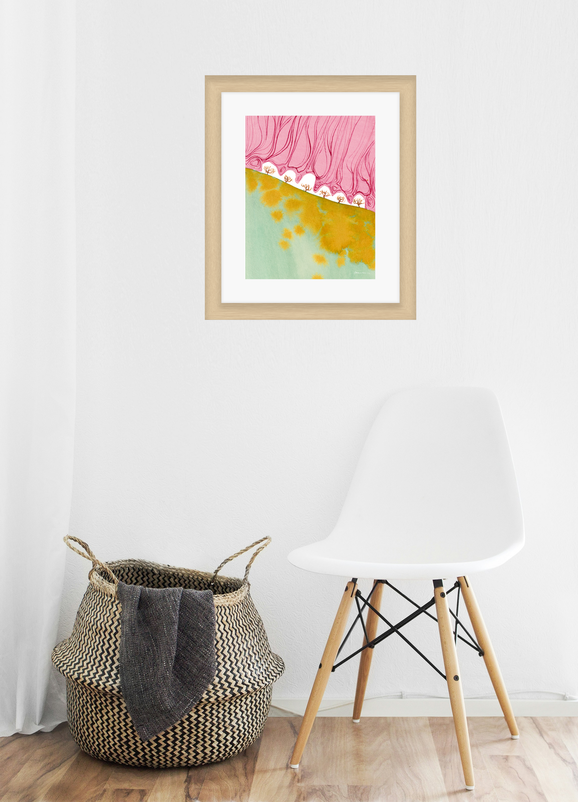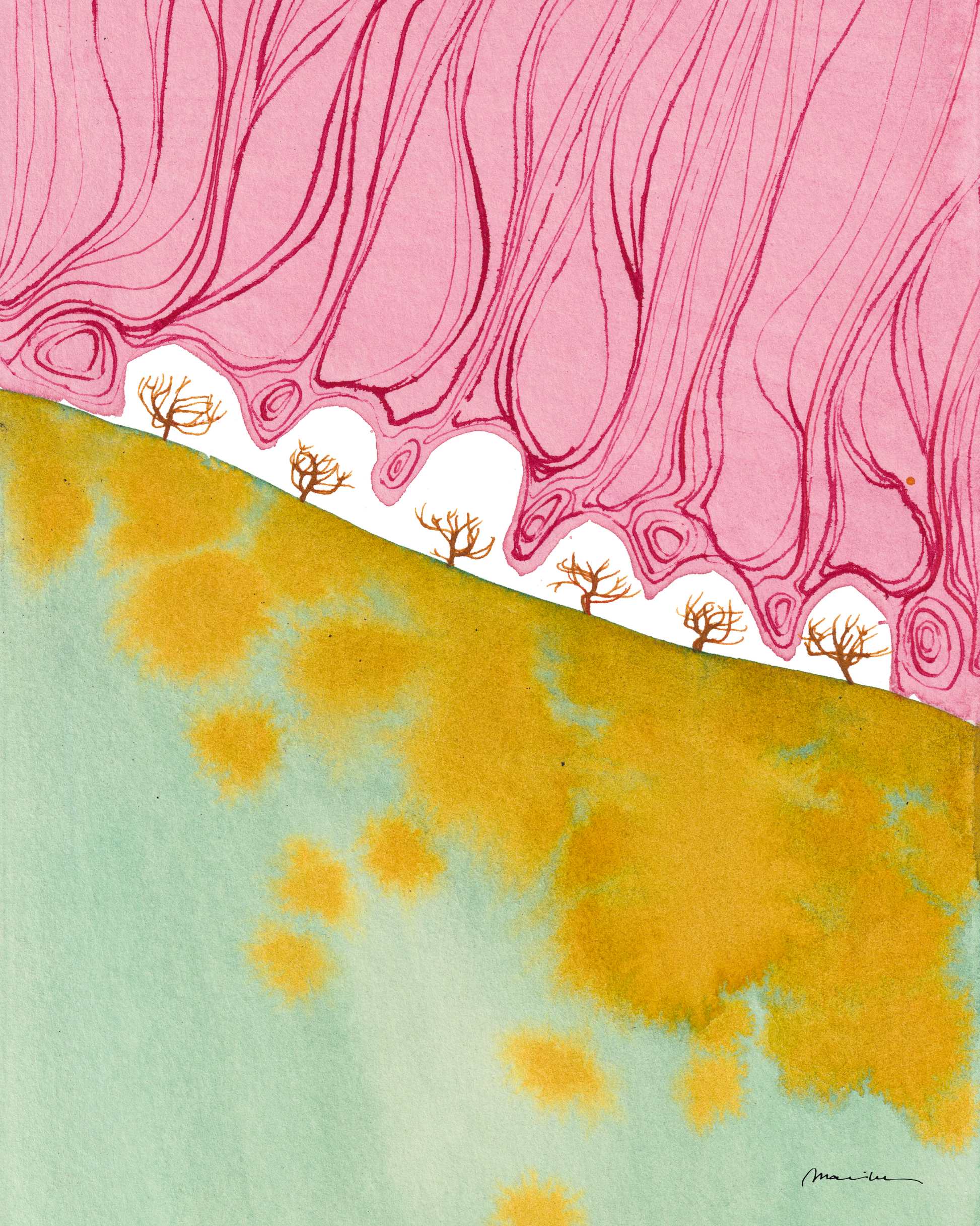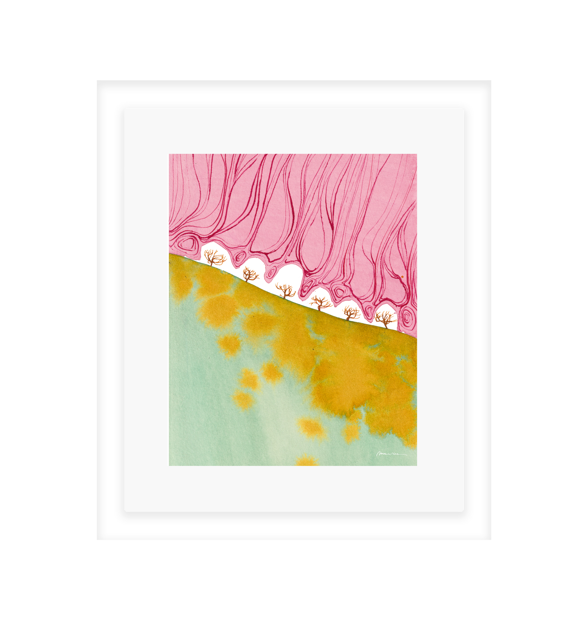 Mariken van Heugten’s work traces the delicate boundary between the organic and the abstract. Working primarily with ink, she begins with simple forms—shapes found in nature, fleeting impressions, or marks of daily life—from which emerge compositions that feel fluid and whimsical. Her prints carry a quiet rhythm: soft washes of tone layered with bold, gestural lines, creating a visual language that feels timeless, tactile, and profoundly playful.